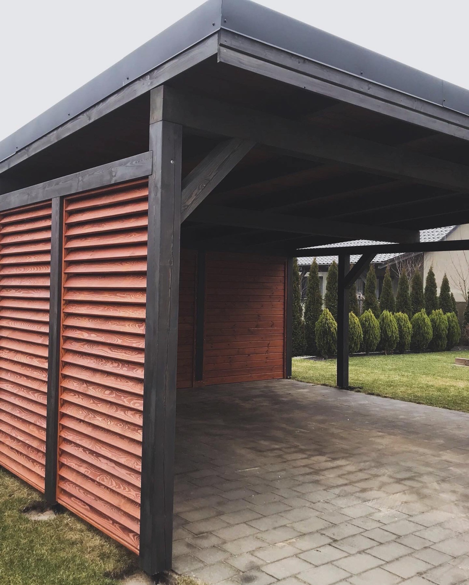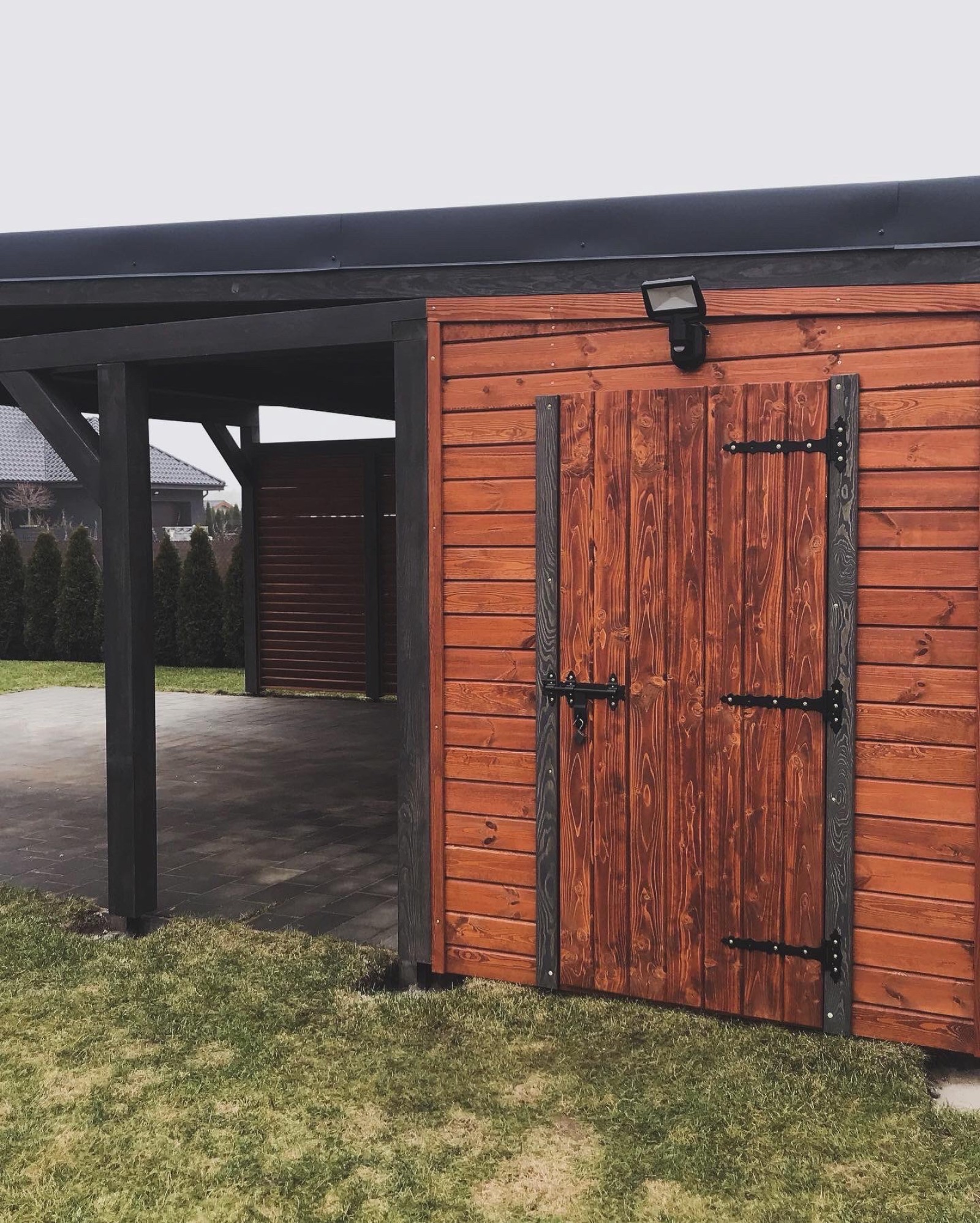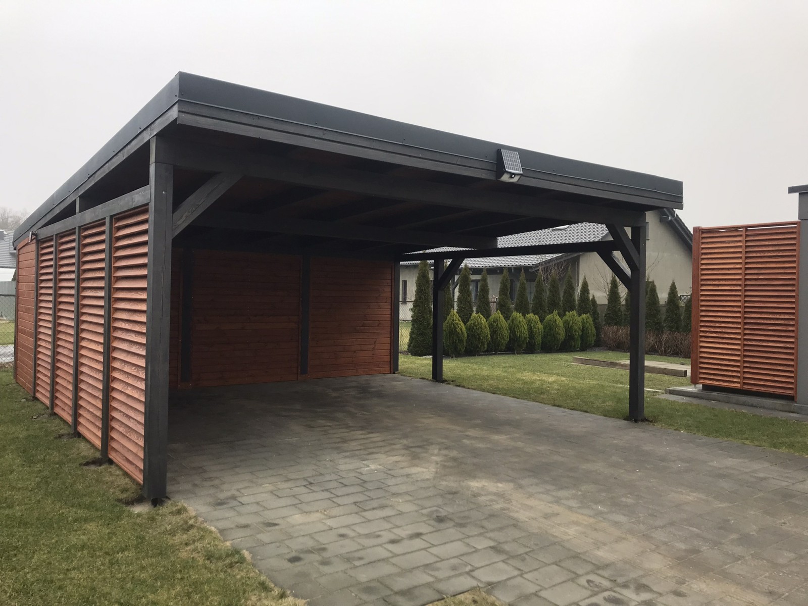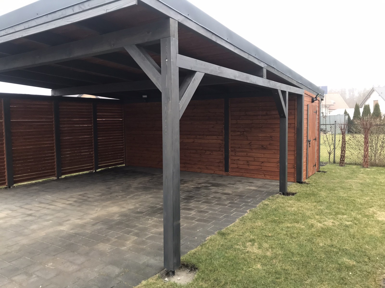 Wiata garażowa z wbudowanym domkiem